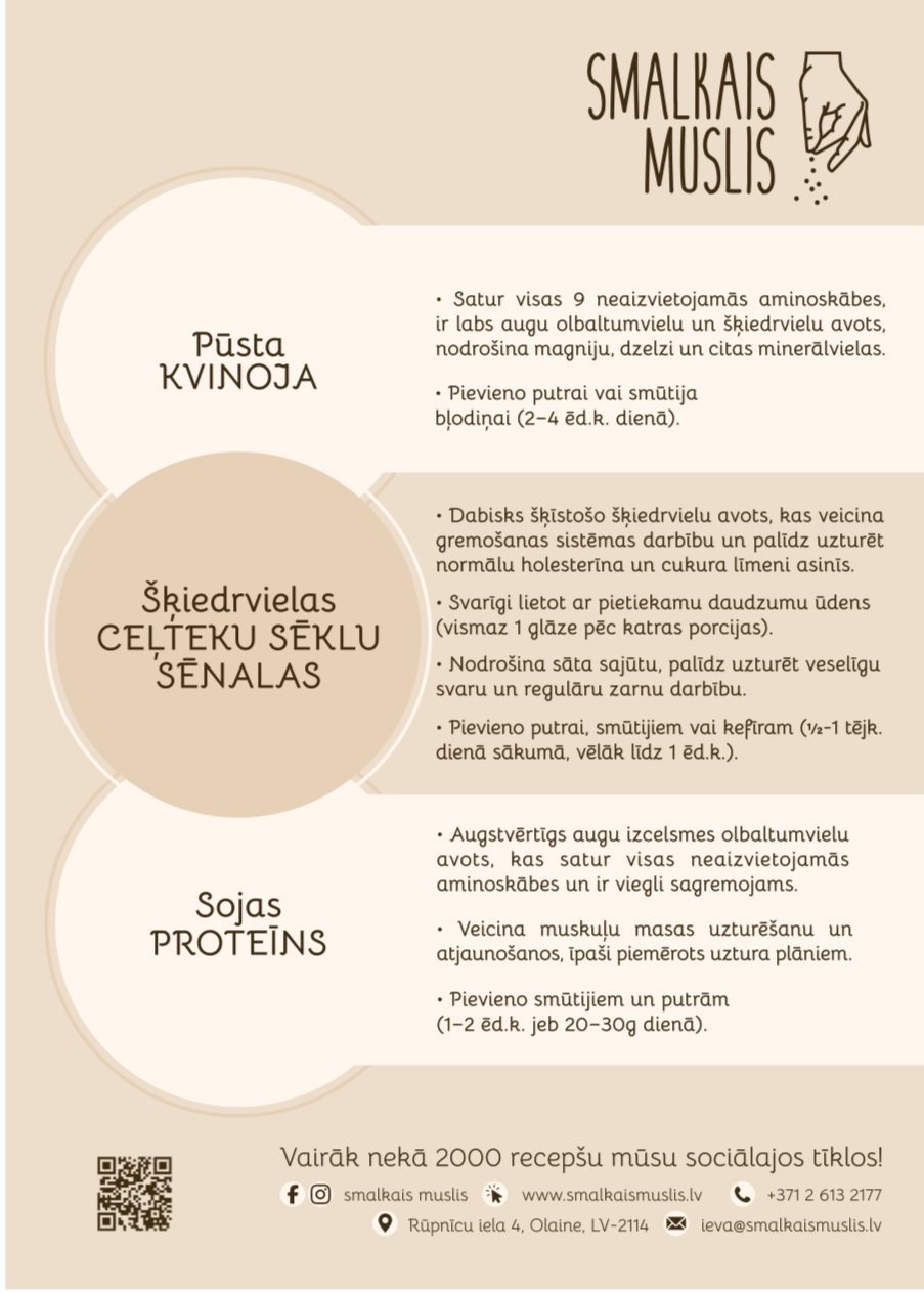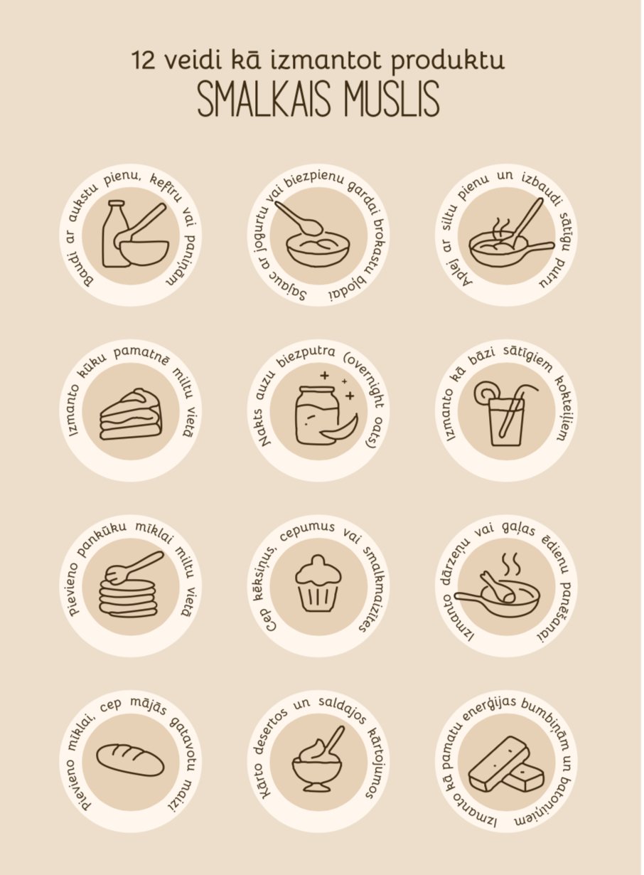 Smalkais muslis ir gards, sātīgs un veselīgs produkts bez papildus pievienota cukura. Saldumu tam piešķir augļi un ogas, kas kopā ar pilngraudu auzu pārslām tiek samaltas noteiktās proporcijās un konsistencē, radot funkcionālu produktu. To lieto gan kā klasisko brokastu musli, aplejot ar pienu, kefīru, bezpiedevu vai grieķu jogurtu, gan arī smūtijos, brokastu putrās, pankūku vai kūku mīklās u.c. desertos, izmantojot kā piedevu miltu vietā. Tas satur daudz šķiedrvielu un ogļhidrātu, spēj aizstāt saldumus, garšo bērniem, ideāls sportistiem, piemērots vegāniem un diabētiķiem, jo satur tikai dabīgos augļu un ogu cukurus.